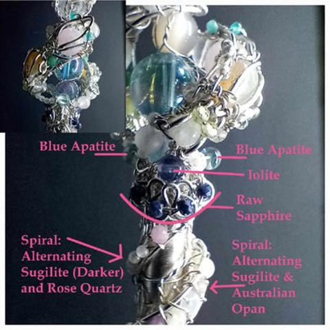 Stones: 18 Australian opal, 2 iolite, 8 sapphire, 4 emerald, 13 sugilite, 18 aquamarine, 31 moonstone, 2 morganite, 8 amazonite, 4 peridot, 1 larimar, 1 aqua aura quartz, 1 fluorite, 49 rose quartz, 4 blue apatite, 8 amethyst, 19 clear quartz (191 total stones).